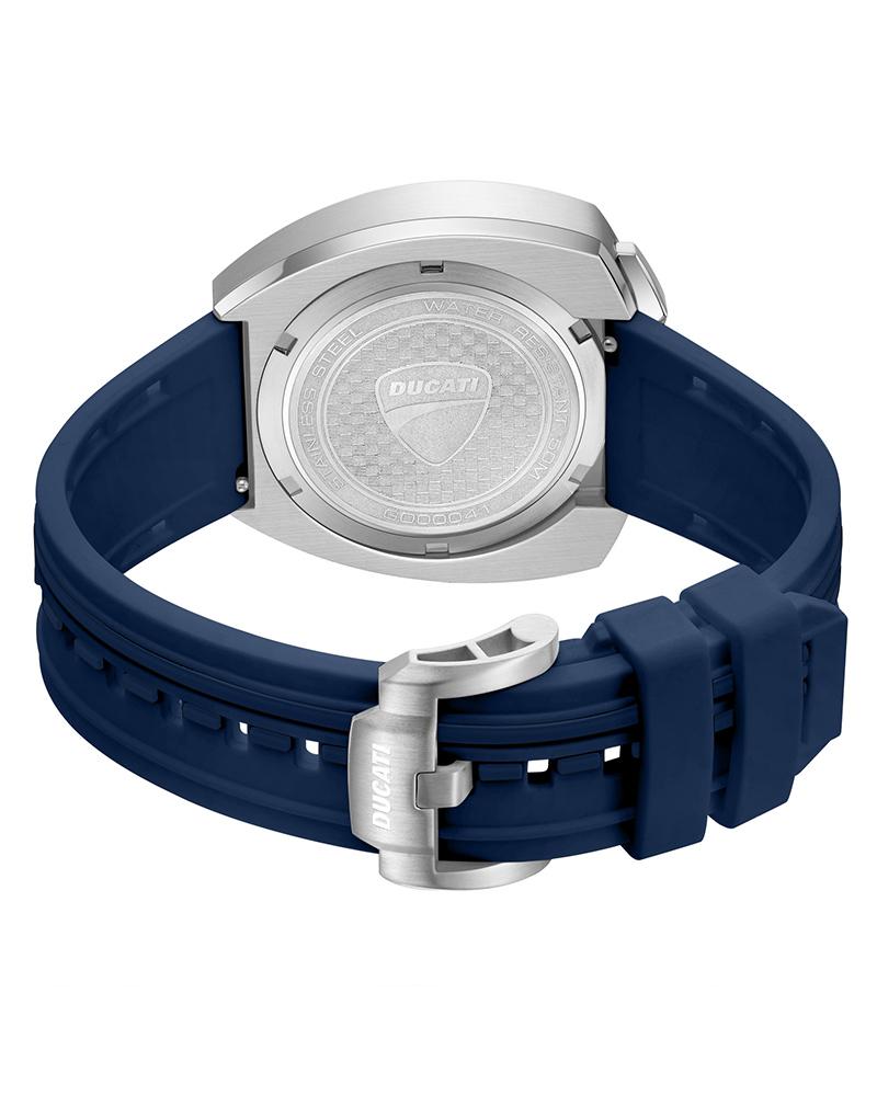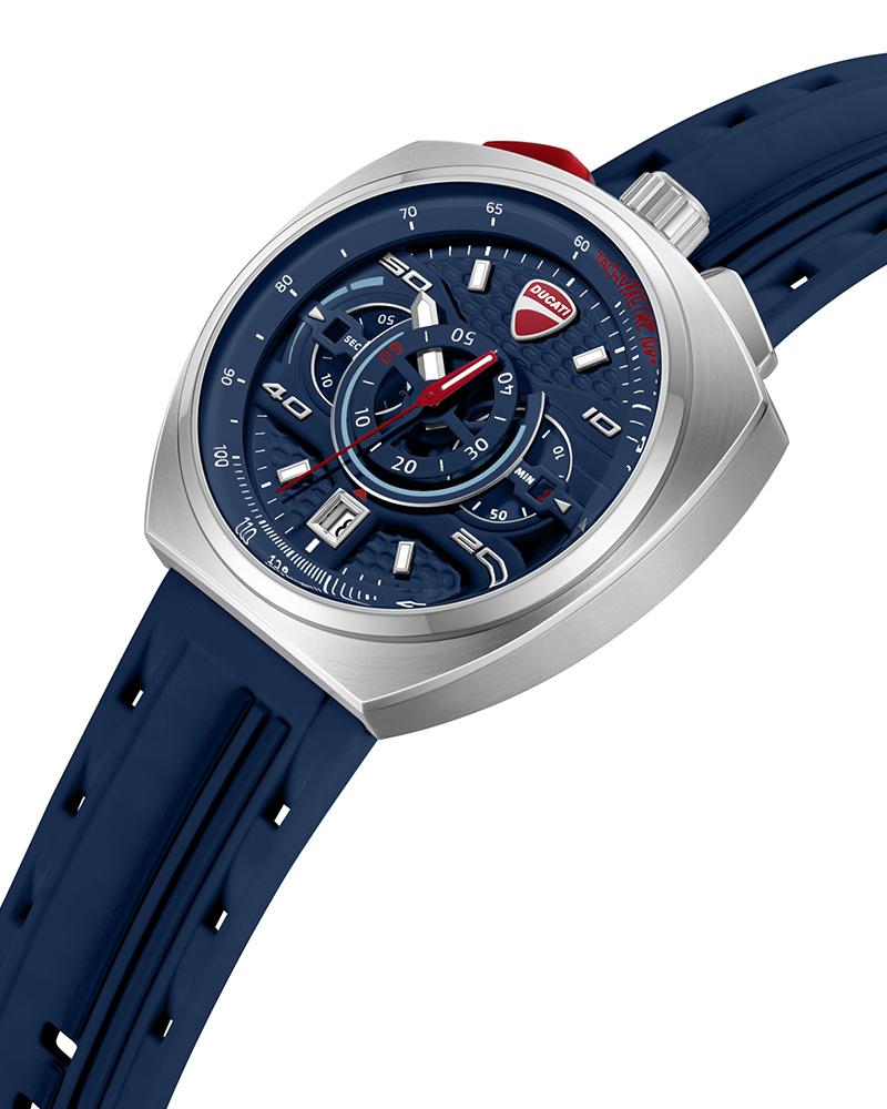 Built to stand apart, DT025 chronograph features a commanding bullhead case that moves the pushers to the top, putting control where it matters most. The stainless steel case blends brushed and polished finishes, framing a blue dial that’s anything but conventional. A layered honeycomb texture as a backdrop, while a screwed-in central component gives the surface a mechanical depth. The dial is anchored by a singular hour hand, with sub-dials positioned on either side. Bold numerals, radial detailing, and three-color accent on the dial complete the layout