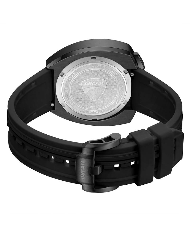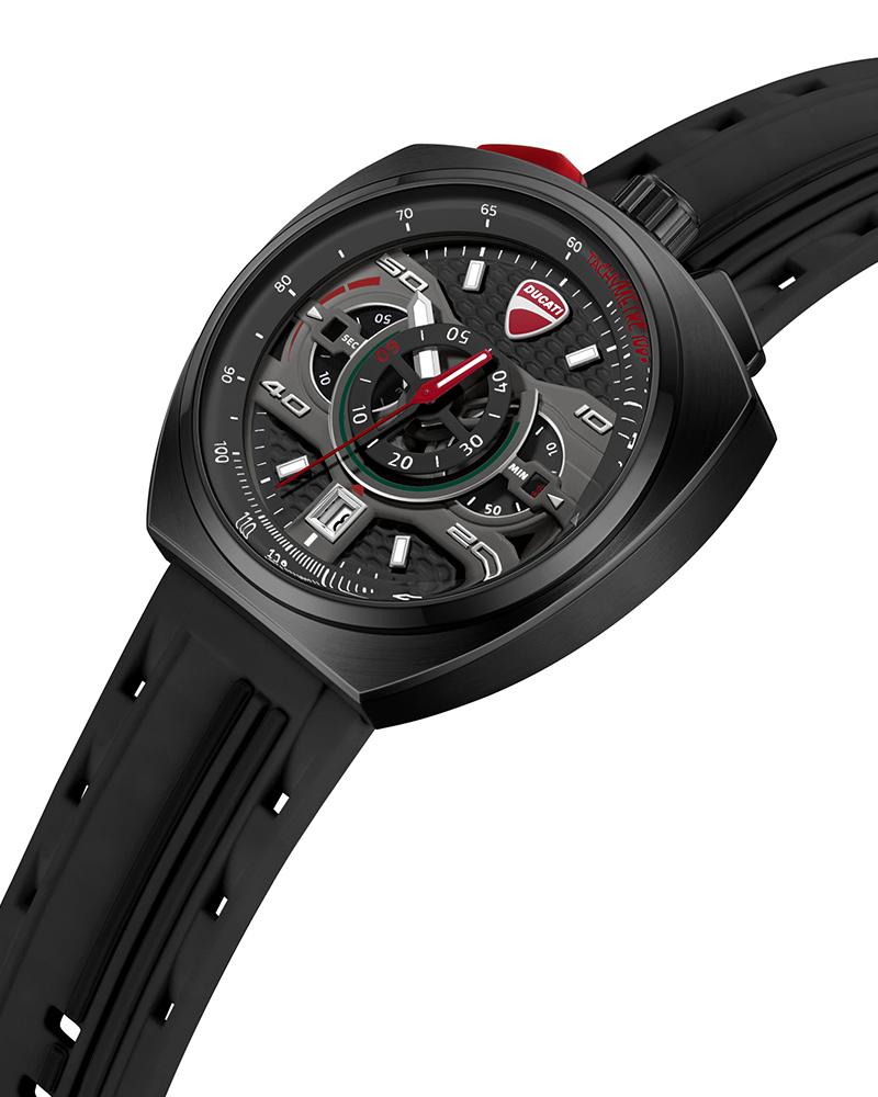 Built to stand apart, DT025 chronograph features a commanding bullhead case that moves the pushers to the top, putting control where it matters most. The ion-plated black case blends brushed and polished finishes, framing a black dial that’s anything but conventional. A layered honeycomb texture as a backdrop, while a screwed-in central component gives the surface a mechanical depth. The dial is anchored by a singular hour hand, with sub-dials positioned on either side. Bold numerals, radial detailing, and three-color accent on the dial complete the layout