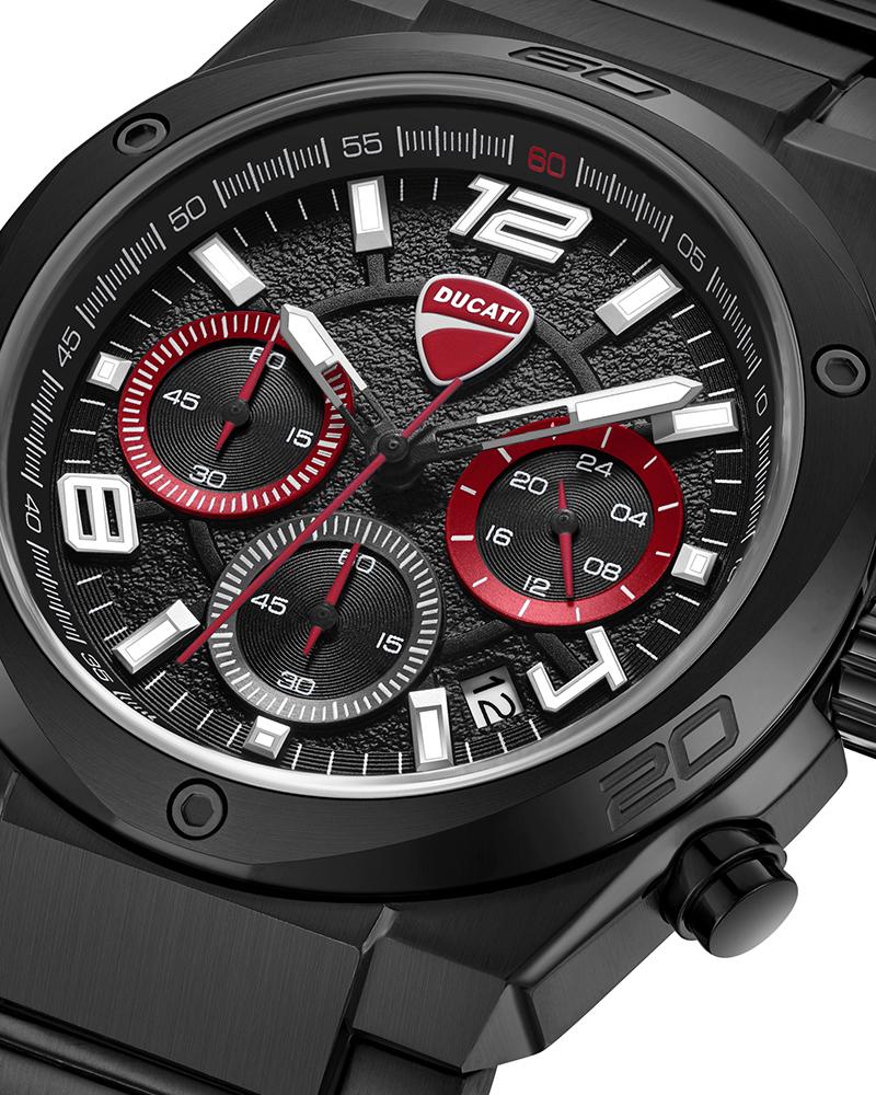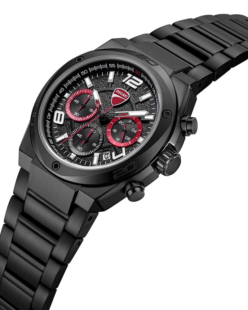 Ducati DT019 channels the aerodynamic DNA of the brand with a case shape that echoes the iconic curve of Ducati’s logo. Crafted in brushed and polished ion-plated black stainless steel, this 43.5 x 51.5mm chronograph delivers sharp presence and muscular elegance. The black bitumen-textured dial – gritty and road-inspired – features three sub-eyes with black backgrounds and red hands for a hit of racing aggression. Ion-plated black topring, crown, pushers, and a full steel bracelet reinforce its all-metal power. With 5 ATM water resistance and precision quartz chronograph function, DT019 is built for riders who is relentless.