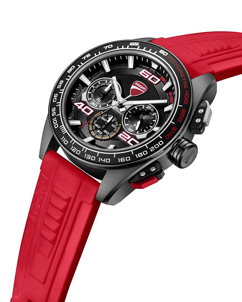A bold chronograph shaped by Ducati’s race-ready attitude. The black dial is cut with red detailing and three sub-dials arranged like clustered gauges. The tachymeter ring marked in white and red delivers at-a-glance timing. The vertically fluted crown gives secure control, flanked by color-accented pushers. Finished in ion-plated black with a high-grip red silicone strap, and sealed under curved mineral glass – this watch is tuned for precision.