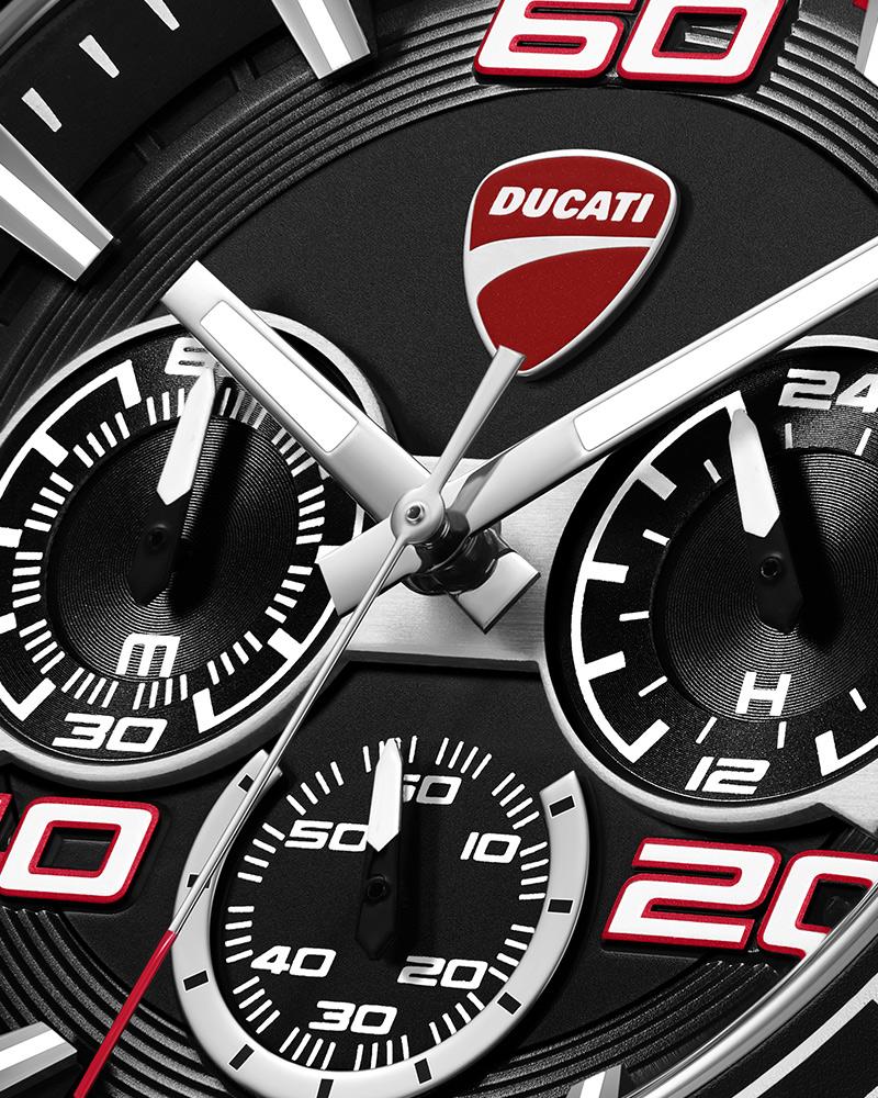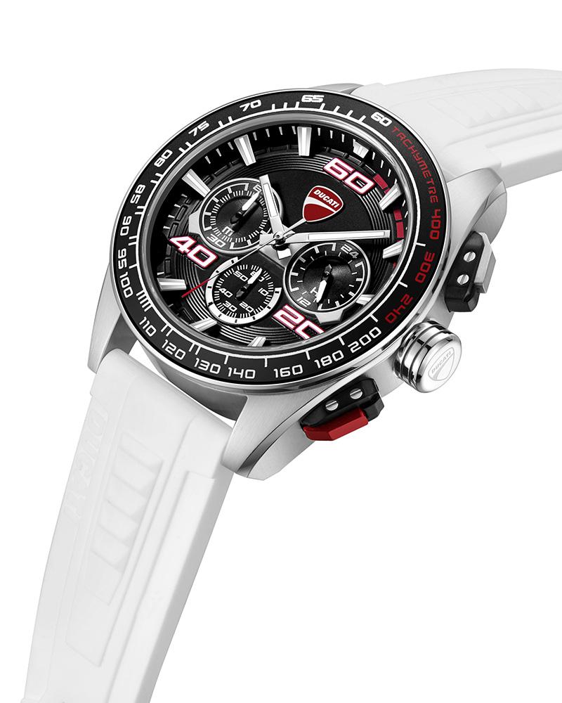 A bold chronograph shaped by Ducati’s race-ready attitude. The black dial is cut with red detailing and three sub-dials arranged like clustered gauges. The tachymeter ring marked in white and red delivers at-a-glance timing. The vertically fluted crown gives secure control, flanked by color-accented pushers. Anchored by a high-grip red silicone strap, every detail of this timepiece leans into Ducati’s relentless drive.