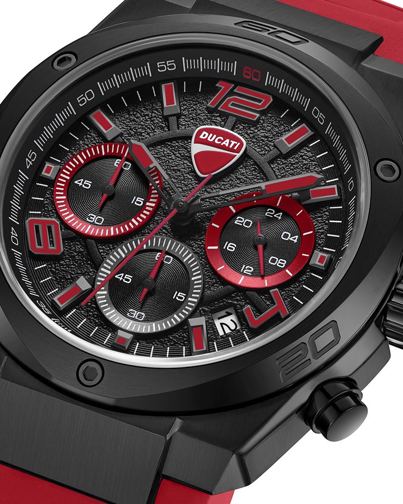 Ducati DT019 channels the aerodynamic DNA of the brand with a case shape that echoes the iconic curve of Ducati’s logo. Crafted in brushed and polished ion-plated black stainless steel, this 43.5 x 51.5mm chronograph delivers sharp presence and muscular elegance. The black bitumen-textured dial – gritty and road-inspired – features three sub-eyes framed in red for a hit of racing aggression. Screw-down black ion-plated topring, anchor the build in all-metal strength. Finished with a red silicone strap that adds flex and contrast, this chronograph pairs muscle with motion. With 5 ATM water resistance and precision quartz timing, DT019 is made for riders who are relentless.
