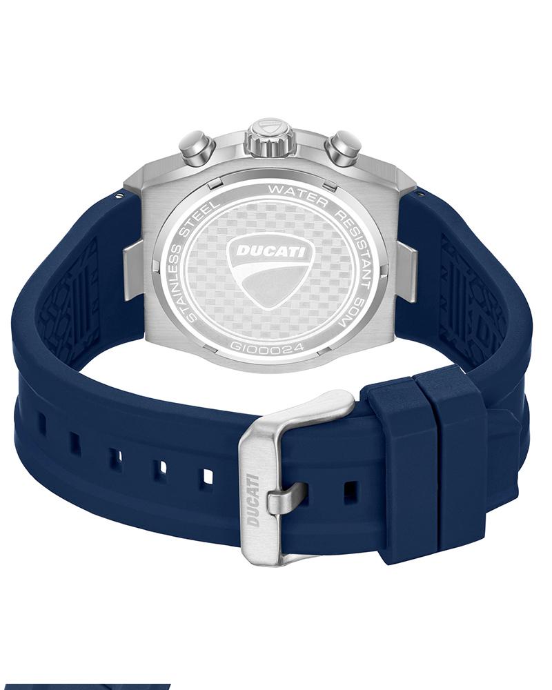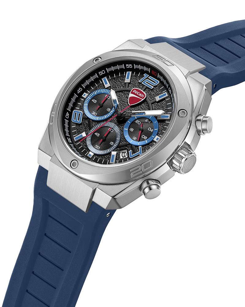 Ducati DT019 channels the aerodynamic DNA of the brand with a case shape that echoes the iconic curve of Ducati’s logo. Crafted in brushed and polished stainless steel, this 43.5 x 51.5mm chronograph delivers sharp presence and muscular elegance. The blue bitumen-textured dial – gritty and road-inspired – features three sub-eyes with red hands for a hit of racing aggression. Screw-down topring, anchor the build in all-metal strength. Finished with a blue silicone strap that adds flex and contrast, this chronograph pairs muscle with motion. With 5 ATM water resistance and precision quartz timing, DT019 is made for riders who are relentless.