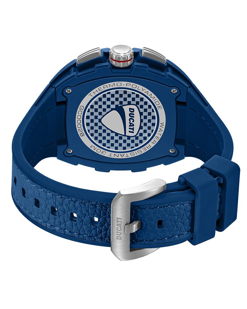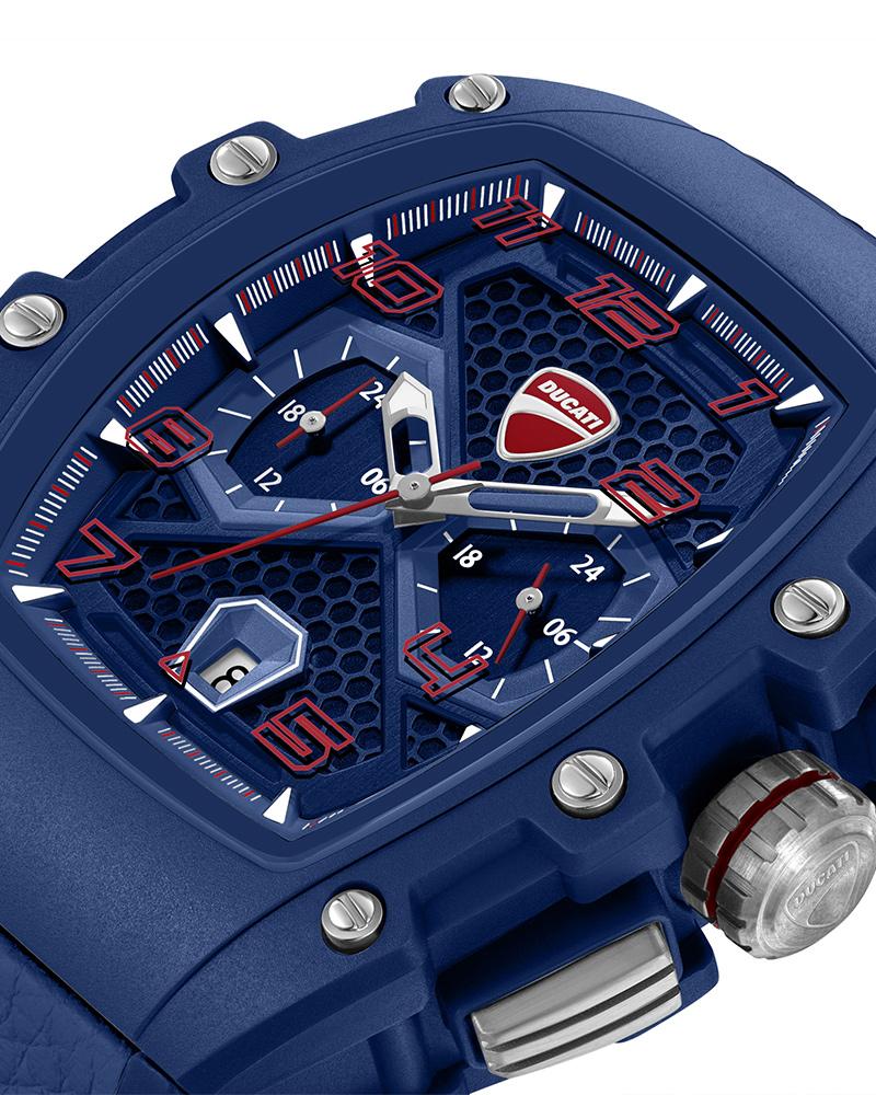 A bold expression of Ducati’s design language, DT023 multifunction watch stands out with its distinctive tonneau-shaped blue matt case and muscular profile. The blue finish is matched with a screw-accented topring, giving the 44 x 52mm case a technical, locked-in look. The blue dial features a honeycomb texture and layered depth, framed sub-dials, and a date window at six o’clock – precision built into every detail. Curved mineral glass, stainless steel pushers, and crown complete the high-contrast construction, while a hybrid blue silicone and leather strap keeps the fit confident and comfortable.
