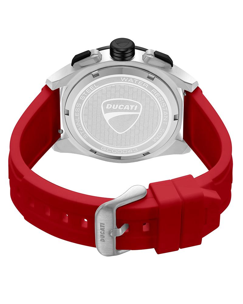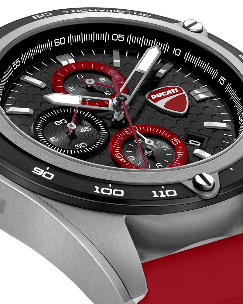 A machine that never backs off, DT028 commands attention with its 44 x 52mm stainless steel case. The black matte dial is cut with a dynamic honeycomb texture, overlaid with red-ringed sub-dials that echo Ducati’s instrument clusters. At 3 o’clock, the Ducati logo marks its territory – unmistakable and proud. The tachymeter bezel in steel and black frames the action. The crown and pushers are IP black – rugged and built for control. Finished with a bold red silicone strap, DT028 delivers the energy, detail, and edge every Ducati fan looks for.