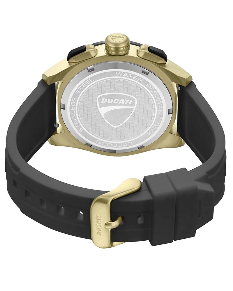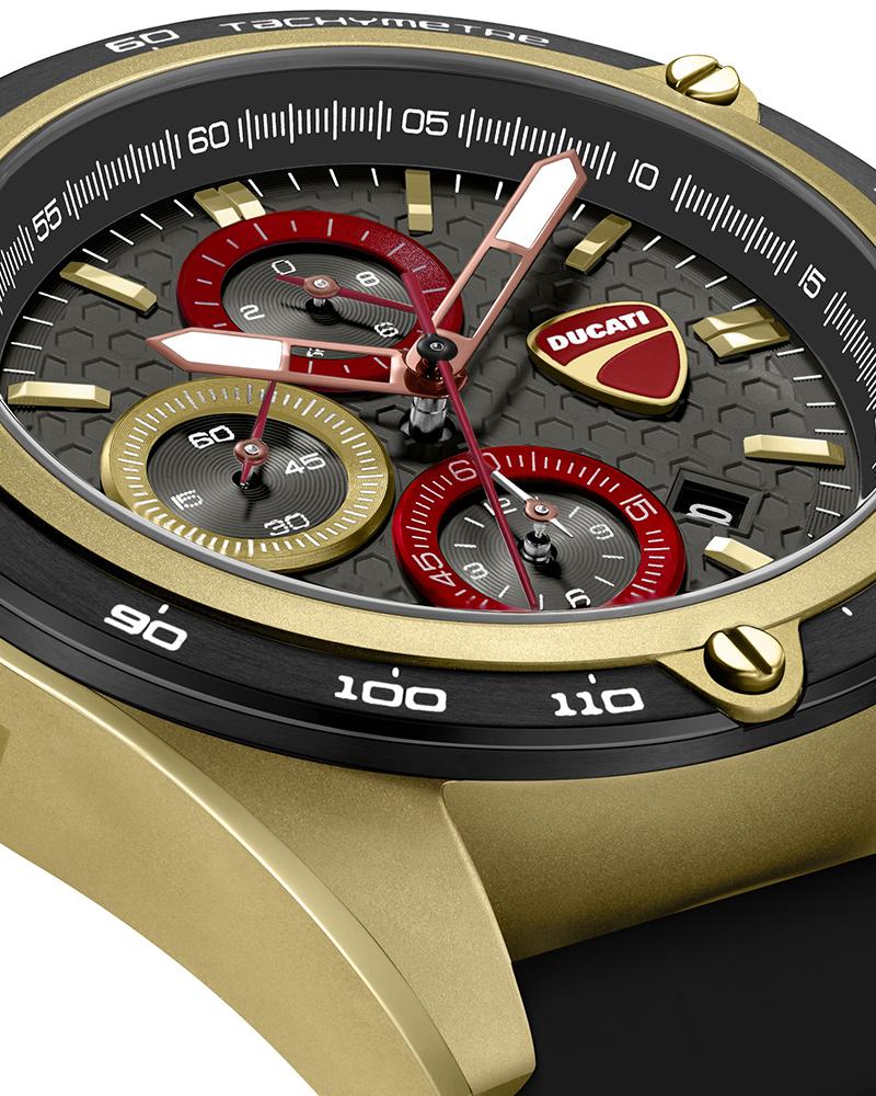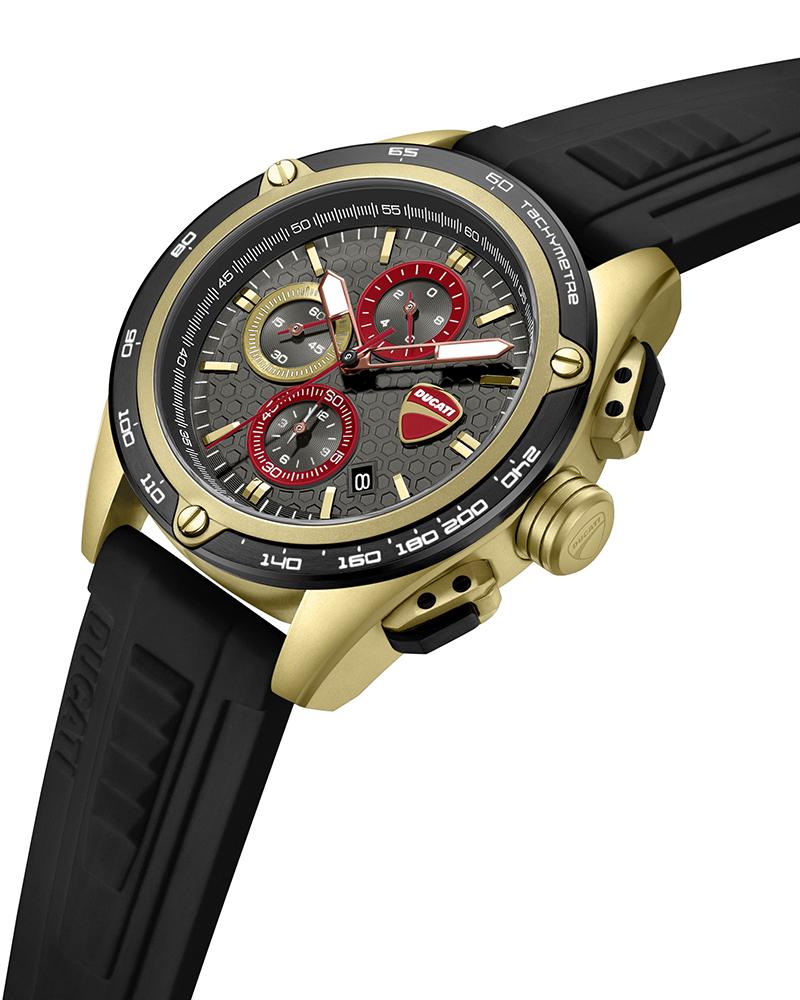A machine that never backs off, DT028 commands attention with its 44 x 52mm ion-plated khaki case. The gray matte dial is cut with a dynamic honeycomb texture, overlaid with red-ringed sub-dials that echo Ducati’s instrument clusters. At 3 o’clock, the Ducati logo marks its territory – unmistakable and proud. The tachymeter bezel in ion-plated black and khaki frames the action. The crown and pushers are rugged and built for control. Finished with a bold black silicone strap, DT028 delivers the energy, detail, and edge every Ducati fan looks for.