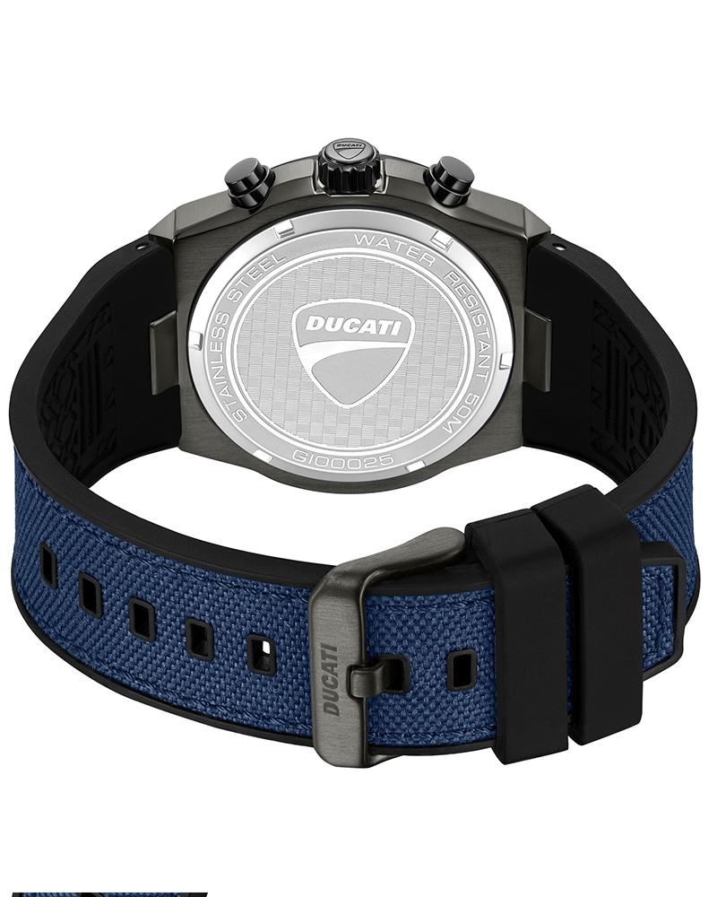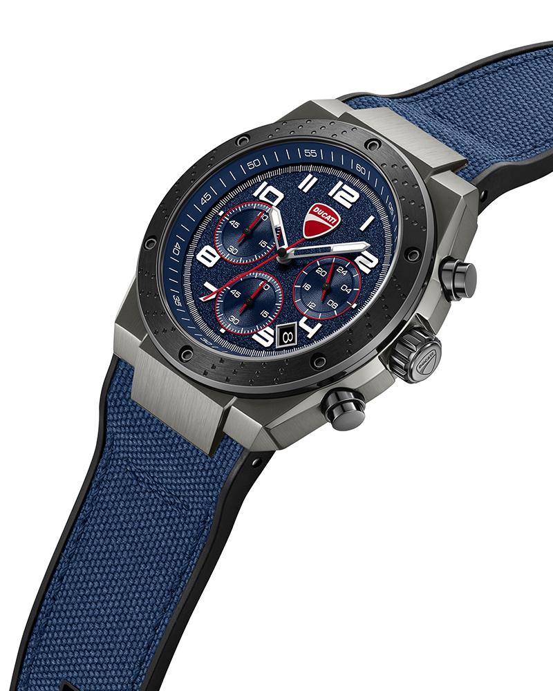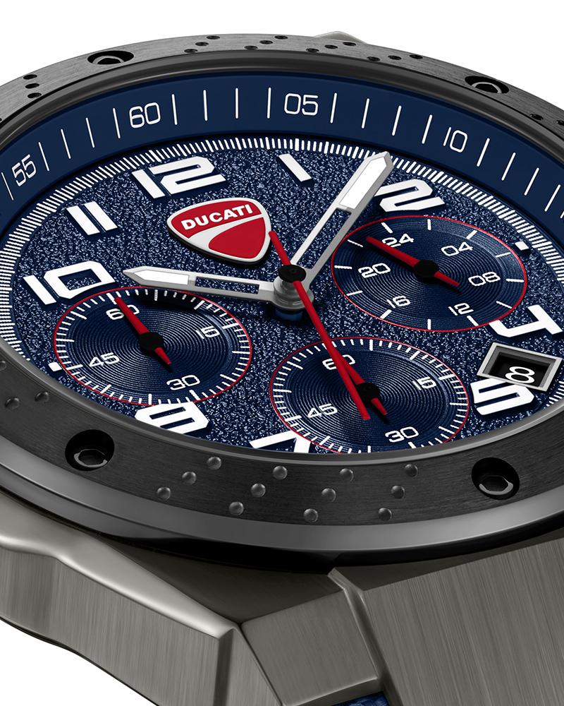 Built like a machine, detailed like a Ducati. DT020 features a grain-textured blue dial anchored by three sub-dials and a date function. A raised, screwed-in black topring with a unique tri-dot pattern – technical, deliberate, and unmistakably mechanical. With a dual-material strap – black silicone and blue nylon, this chronograph is for those who want every detail to pull its weight.
